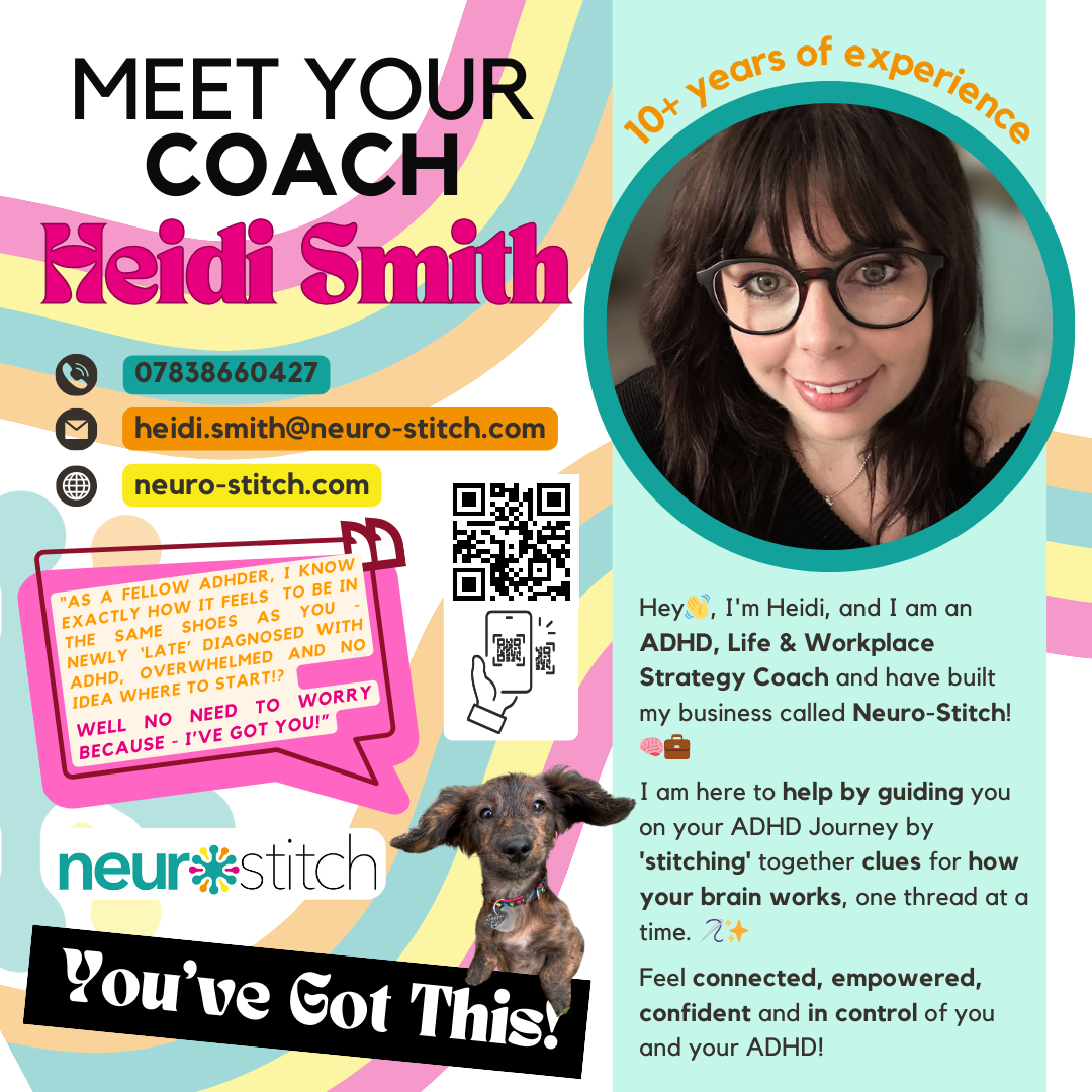 Including 1 to 1 Coaching, Mentoring and Training for Late Diagnosed, Newly Diagnosed & Self Diagnosed Individuals and Professionals. Specialising in ADHD & AuDHD Coaching - get coaching from someone who truely gets it! An ADHD & Neurodiversity Coach who is Neurodivergent too!