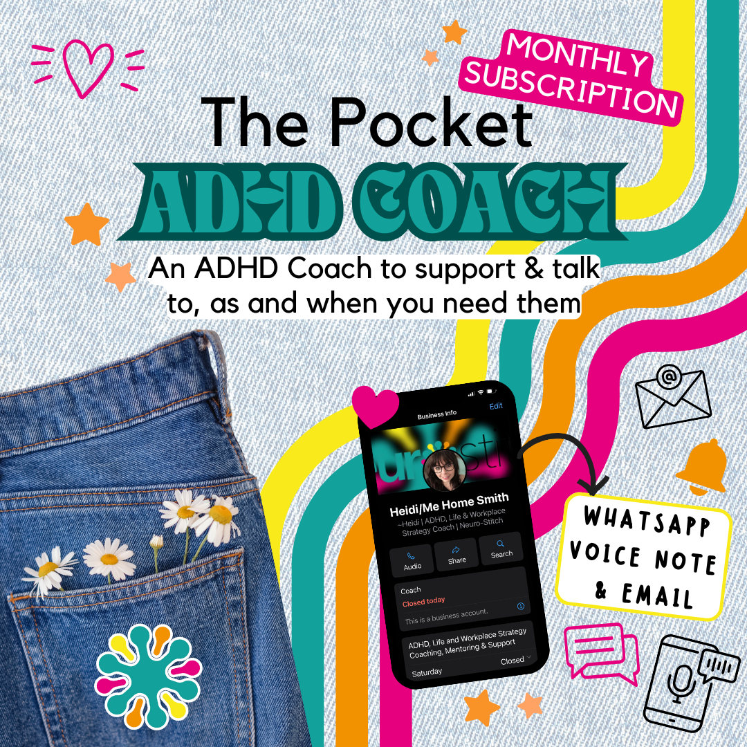 Click here to find out more and SIGN UP!Imagine having flexible ADHD Coaching support that fits you! With the Pocket ADHD Coach you get an ADHD Coach and Bestie in your back pocket, and up to 1 hour of Coaching and Support through Email, WhatsApp Messages or voice notes - to provide you with gentle accountability and real-time help when the ADHD Villains or executive dysfunction strikes. Plus, no long-term tie-ins!